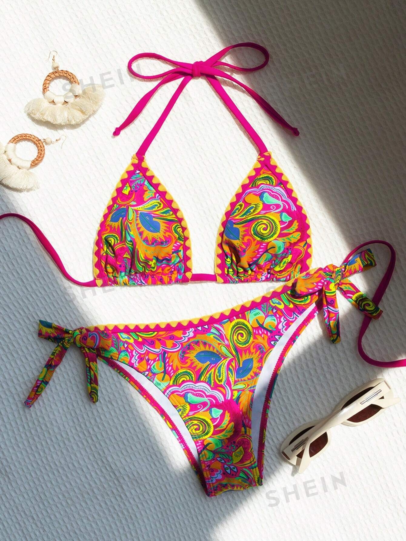 SHEIN Swim Summer Beach Allover Print Halter Triangle Bikini Set